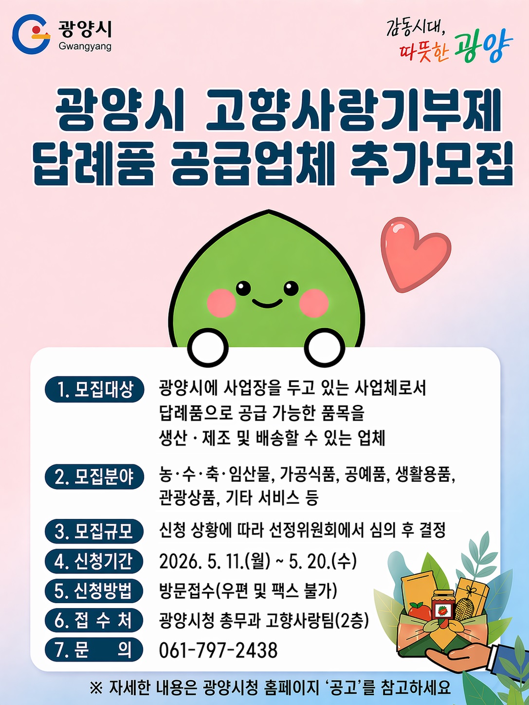 신청 대상은 광양시에 사업장을 두고 답례품 생산·제조 및 배송이 가능한 업체로, 온라인 등록과 판매를 위한 통신판매업 신고가 필요하다.