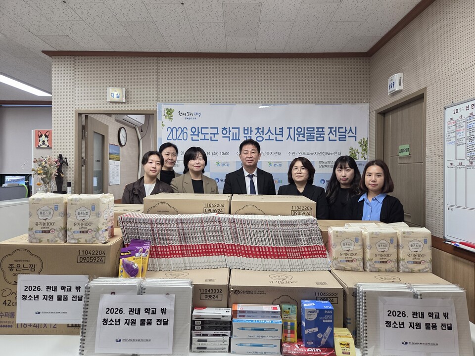 전라남도 완도교육지원청(교육장 이철영)은 4월 14일(화), 지역 내 학교 밖 청소년들의 학습권 보장과 건강한 성장을 지원하기 위해 완도군 학교 밖 청소년지원센터(꿈드림센터)에 교육 물품 및 생활필수품을 전달했다.