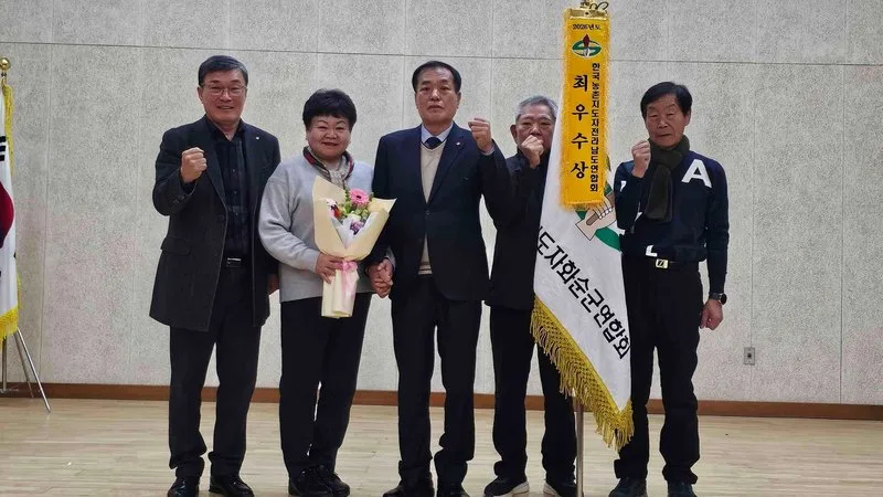 상금 50만 원과 깃띠 수여 - 화순군(군수 구복규)은 27일 (사)한국농촌지도자화순군연합회(회장 정찬율)가 ‘2025년 한국농촌지도자전라남도연합회 연말평가’에서 최우수상 수상의 영예를 안았다고 밝혔다.
