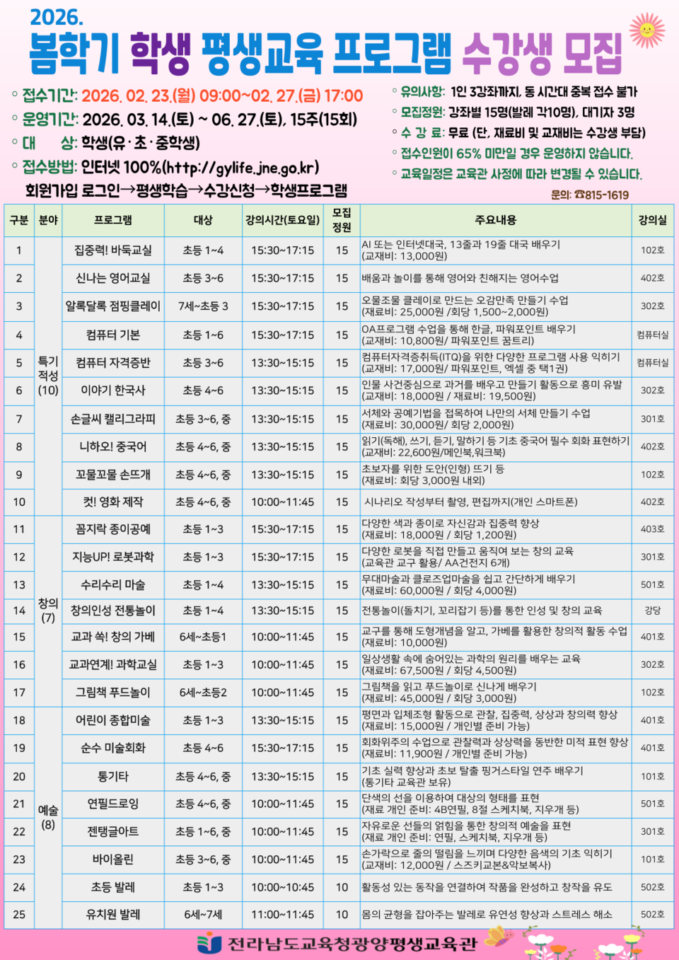 전라남도교육청광양평생교육관(관장 오준경)은 오는 2월 23일(월)부터 27일(금)까지 「2026.