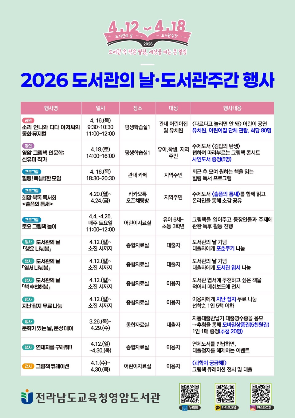 영암공공도서관)은 제4회 도서관의 날과 제62회 도서관주간을 기념하여 오는 4월 12일부터 4월 30일까지 지역민과 함께하는 풍성한 독서문화 행사를 운영한다.