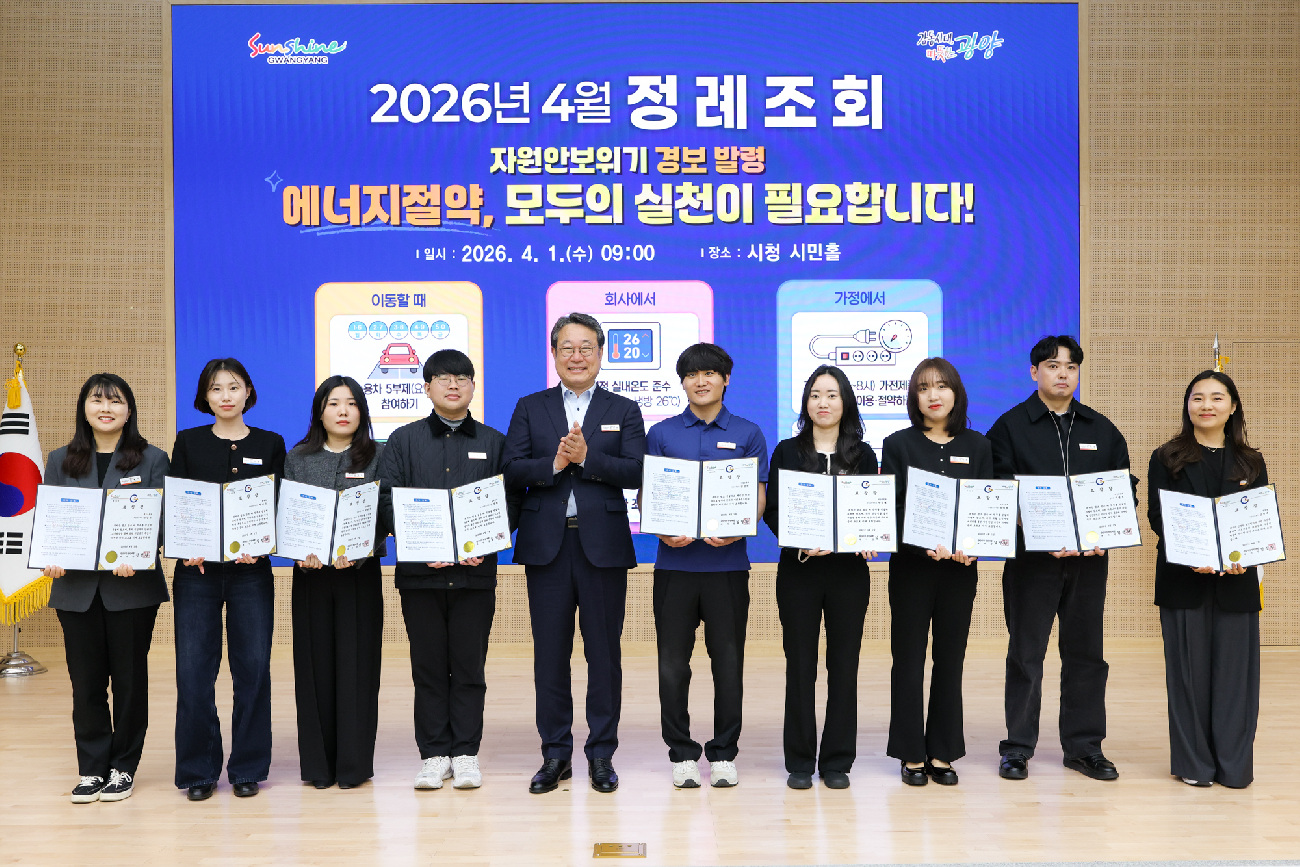 한편, 광양시는 이날 정례조회에 이어 시청 창의실에서 확대간부회의를 열고 시정 운영 현황을 점검하고 주요 현안사항을 논의했다.