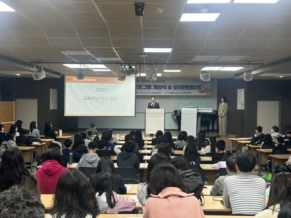 순천교육지원청(교육장 김신교)은 4월 11일(토) 순천대학교 인문예술대학 지하 1층 합동강의실에서 초등학교 5·6학년과 중학교 1~3학년 선발 학생 및 학부모가 참석한 가운데 ‘2026 중국어교육(이중언어) 프로그램 개강식’을 열고 본격 운영에 들어갔다.