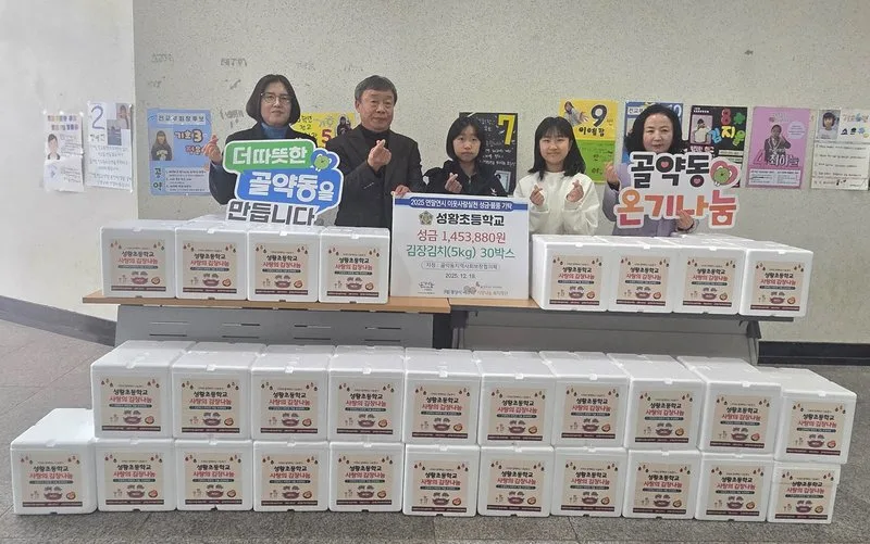 성황초등학교(교장 민황용)가 지난 19일, 광양시 골약동지역사회보장협의체(공공위원장 박순옥, 민간위원장 정용태)에 학교 나눔 장터 수익금과 김장김치 30박스를 기탁하며 이웃사랑을 실천했다. 성황초등학교는 지난 12월 3일, 사용하지 않는 의류·장난감·도서 등을 학생들이 직접 판매하는 ‘학교 나눔 장터’를 열어 경제·환경·나눔의 가치를 체험하는 교육 활동을 운영했으며, 이를 통해 마련된 수익금 1,453,880원 전액을 지역 내 어려운 이웃을 돕는 데 사용해 달라며 골약동지역사회보장협의체에 전달했다. 또한 학생들이 19일 김장 체험 행사를 통해 정성스럽게 담근 김장김치 5kg짜리 30박스를 홀몸 어르신과 한부모가정 등 관내 취약계층 30가구에 전달하며 따뜻한 마음을 나눴다. 장수정 학생회장은 “나눔 장터 운영과 김장 나눔 행사를 통해 전통과 공동체 문화를 직접 체험할 수 있었고, 홀로 지내시는 어르신 등 이웃들에게 작은 행복을 전할 수 있어 더욱 뜻깊은 시간이었다”고 소감을 전했다. 민황용 성황초등학교 교장은 “학생들이 스스로 참여하고 준비하는 뜻깊은 행사가 올해로 3년째 이어지며, 이를 통해 성황초 학생들이 이웃사랑을 몸소 실천하고 있다”며 “앞으로도 사랑과 존중을 바탕으로 꿈을 키우는 행복한 학교를 만들어 가겠다”고 말했다. 시 관계자는 “배움과 나눔을 실천하며 지역사회에 큰 행복을 전해준 성황초등학교 학생들과 교직원, 학부모님들께 진심으로 감사드린다”며 “기탁된 성금과 물품은 도움이 필요한 이웃들에게 소중히 전달하겠다”고 밝혔다.