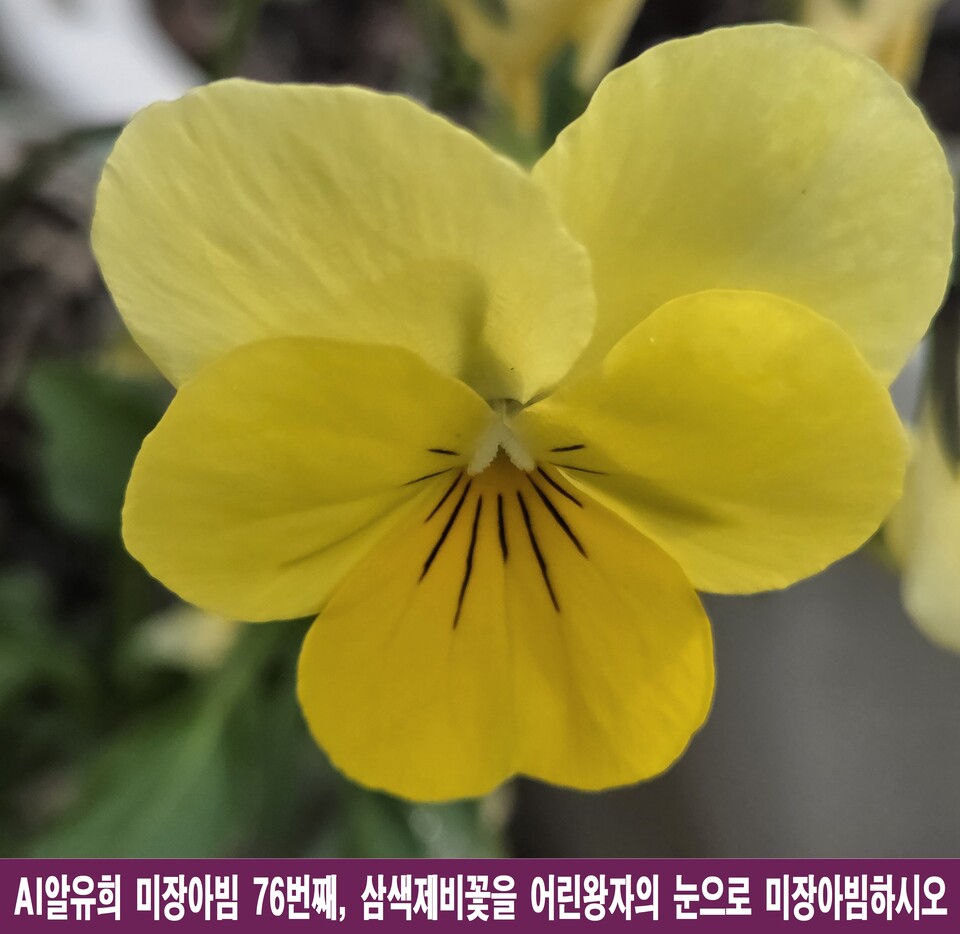 시선의 전도: 나를 응시하는 별의 눈동자 어린왕자가 별들을 바라볼 때 별들이 웃고 있다고 믿었듯, 삼색제비꽃의 눈동자 무늬는 우리를 향해 미소 짓는 우주의 얼굴입니다.