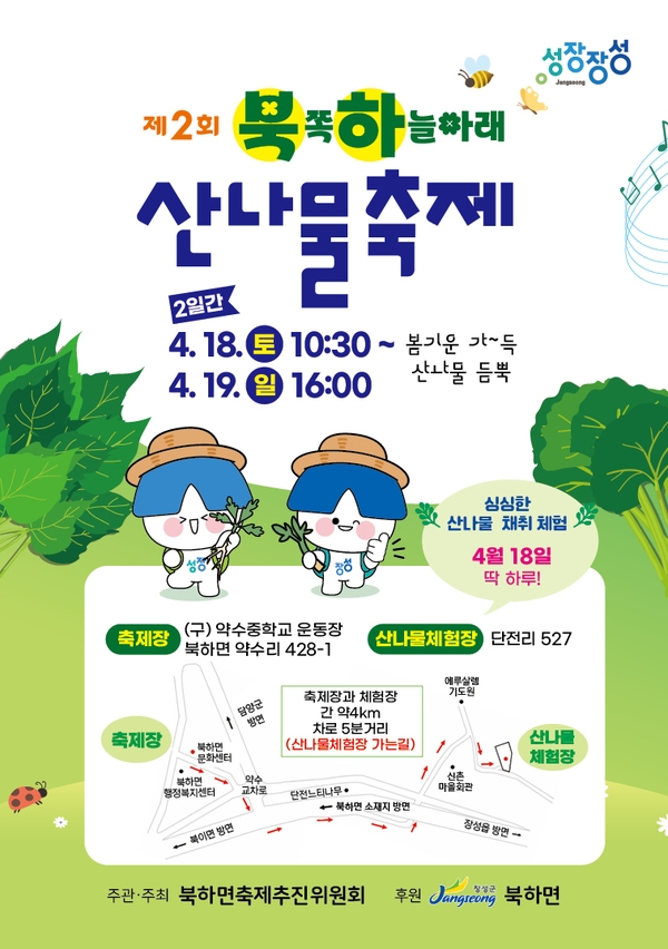 장성군 북하면의 특색을 담은 마을축제인 ‘제2회 북쪽 하늘아래, 산나물 축제’가 18일부터 19일까지 이틀간 옛 약수중학교 운동장에서 열린다.