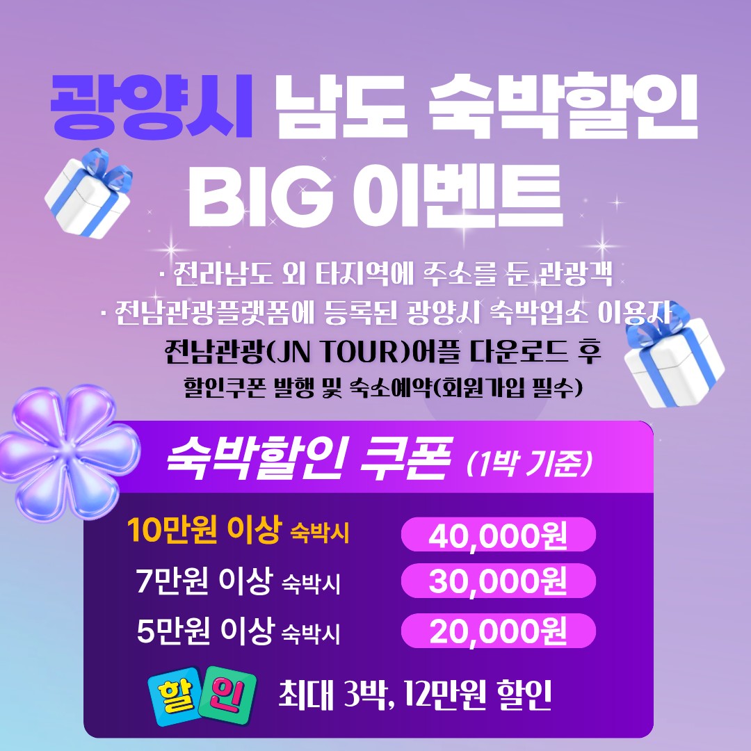 이벤트 참여를 희망하는 관광객은 전남관광플랫폼(JN TOUR)에 회원가입한 뒤 ‘남도 숙박할인 BIG 이벤트’에서 ‘광양시’를 선택해 쿠폰을 발급받으면 된다.
