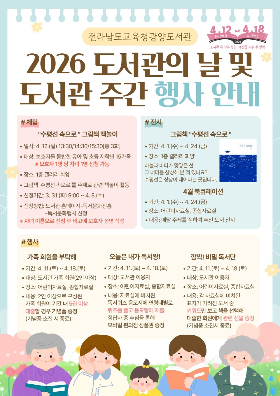 도서관의 역할과 독서의 가치를 알리고 일상 속 책 읽는 문화를 확산하기 위해 마련된 이번 행사는 ▲그림책 ‘수평선 속으로’를 주제로 한 그림책 놀이, ▲가족 회원을 부탁해, ▲깜짝!