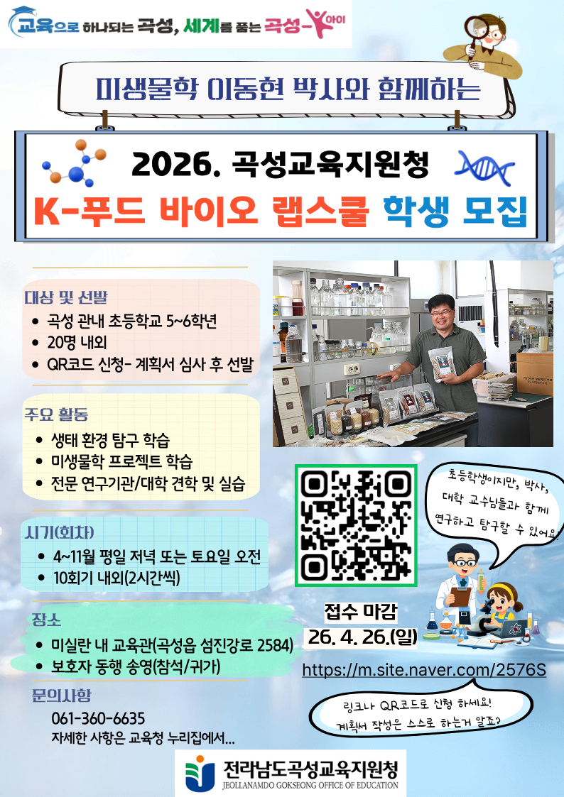 전라남도곡성교육지원청(교육장 심치숙)은 오는 5월부터 11월까지 곡성 관내 초등학교 5~6학년 학생들을 대상으로 **‘곡성 K-푸드 바이오 랩스쿨’**을 운영하며, 참가 학생을 모집한다.