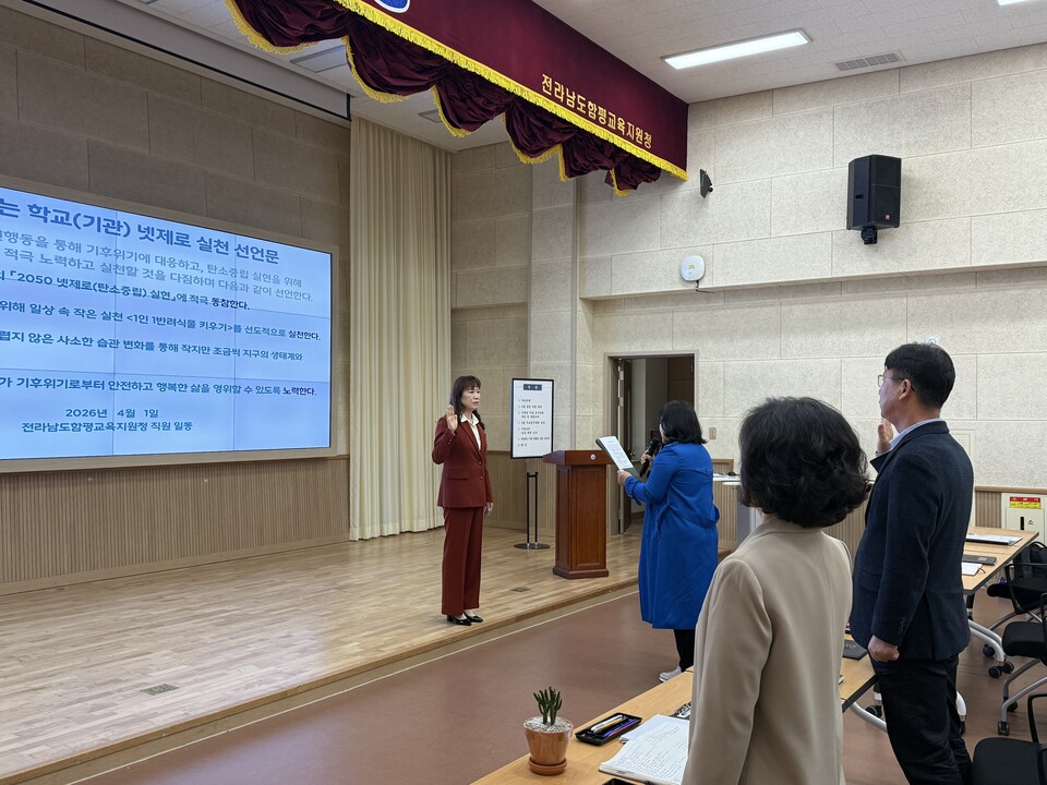 전라남도함평교육지원청(교육장 최은순)은 4월 1일 대회의실에서 전 직원이 참여한 가운데 「2026년 함그래(함평 Green 미래) 지9하는 기관 넷제로(Net Zero) 실천 선언식」을 열고 탄소중립 실현을 위한 실천 의지를 다졌다.