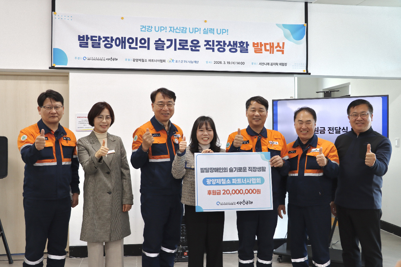 이번 사업은 광양제철소 파트너사협회(회장 김윤철)의 후원으로 추진되며, 서산나래 소속 발달장애인 근로자 22명을 대상으로 건강한 직장생활과 지속적인 근로활동을 지원하기 위해 후원금 2천만 원이 전달됐다.