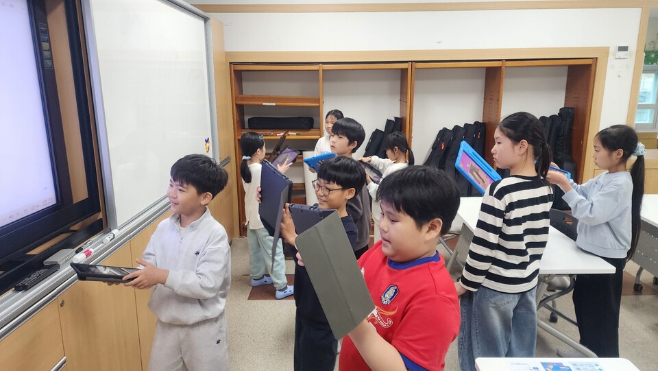 이 날 손불초등학교에서는 개인별 태블릿 PC를 활용하여 AI 펭톡을 활용한 개별 학습 진단 및 수준별 학습이 진행되었다.