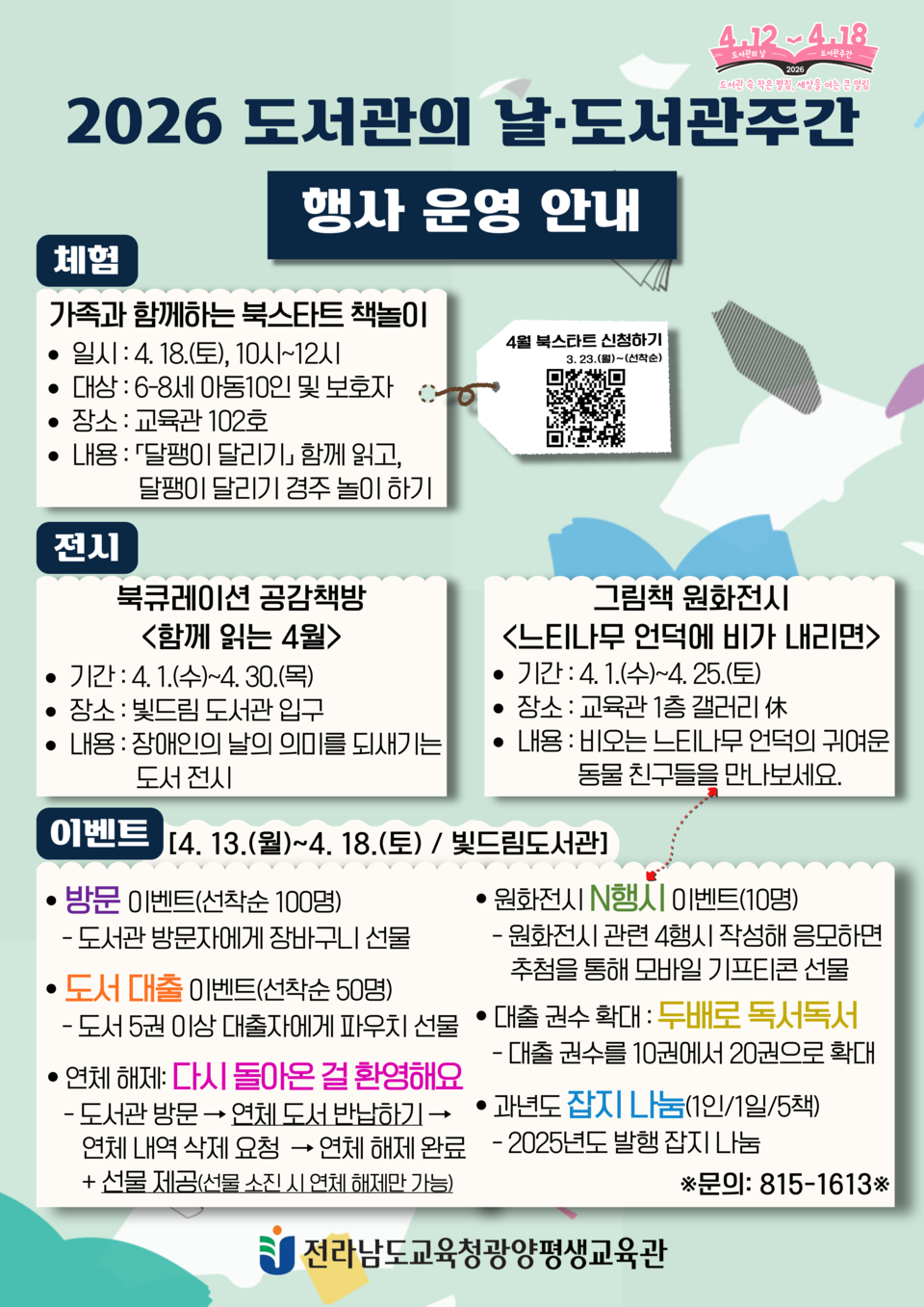 전라남도교육청광양평생교육관(관장 오준경)은 4월 13일부터 4월 18일까지 <도서관 속 작은 펼침, 세상을 여는 큰 열림> 을 주제로 ‘2026년 도서관의 날·제62회 도서관주간’행사를 운영한다.
