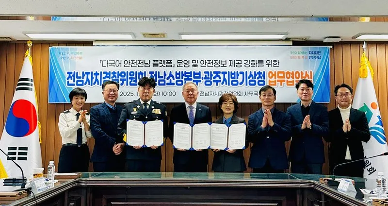 Subtitle: 전남자치경찰위원회가 다국어 안전전남 앱을 활용한 재난 및 긴급안전·기상정보 서비스 강화에 동참한다. 전라남도자치경찰위원회는 최근 전남소방본부와 광주지방기상청과 업무협약을 체결하여 다국어 안전전남 앱을 중심으로 재난 및 긴급안전·기상정보 서비스를 강화하기로 했다. 이번 협약에서는 안정적 운영과 외국인 대상 정보 제공을 목표로 한다. 전남자치경찰위원회는 다국어 안전전남 앱의 총괄을 담당하며, 소방본부에서 화재 및 구조 관련 정보를, 기상청에서 폭염 등 기상 특보와 위험 기상정보를 제공한다. 다국어 안전전남 앱은 영어, 중국어, 베트남어 등 6개 국어로 재난 유형별·상황별 맞춤형 안전정보를 제공하고 기상 상황과 연계한 선제적 안전 안내도 강화할 예정이다. 이렇게 하여 도내 외국인의 준법의식과 지역사회 적응을 돕고, 재난 상황에 대한 초기 대응 능력을 높일 수 있는 앱으로 구축하겠다는 것이다.