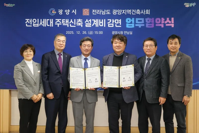 광양시는 26일 시청 만남실에서 전라남도 광양지역건축사회(회장 박동기)와 전입세대 주택신축 설계비 감면 업무협약을 체결했다고 밝혔다.