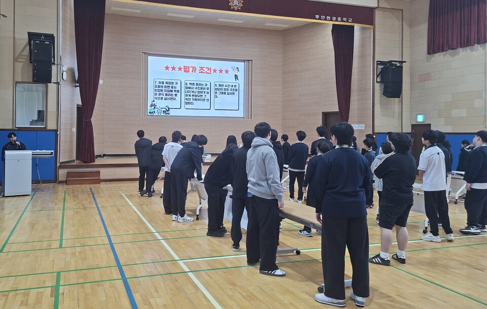 학생들은 4인 1모둠을 구성하여 탑형, 다리형, 기둥형 등 자유로운 형태의 건축물을 제작하였고, 특히 가로·세로 30cm 이내의 규격 안에서 20cm 이상의 높이를 확보하며, 학교에서 제공된 재료만을 사용하여 힘의 분산과 하중 지지의 원리를 구현해야 했다.