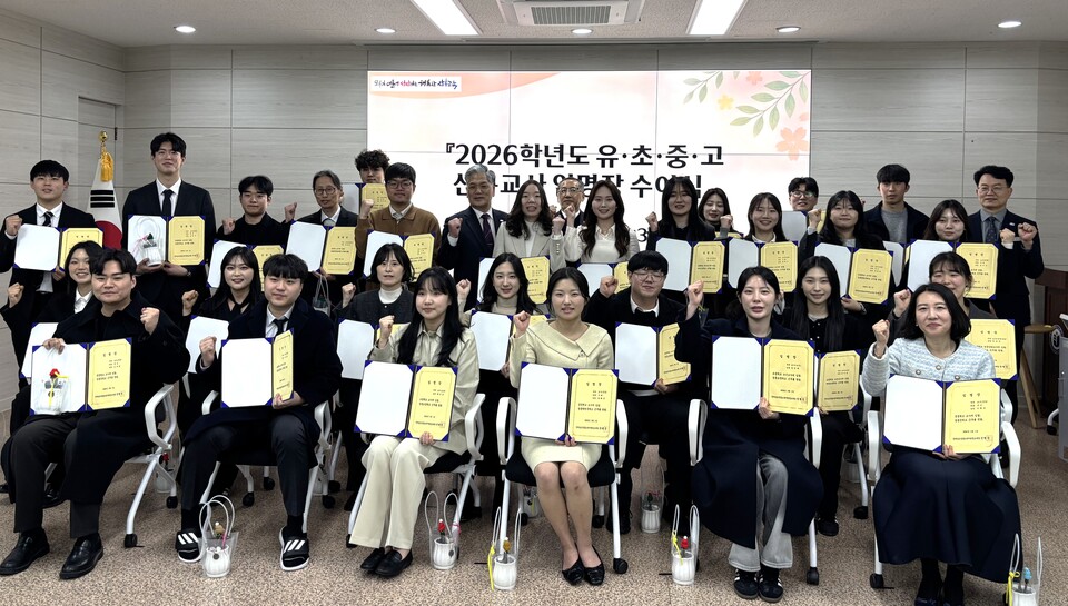 전라남도장흥교육지원청(교육장 정행중)은 2026. 3월 3일(화) 오후 2026학년도 장흥군 유·초·중등 신규교사 32명의 임명장 수여식을 열고 장흥에서 교직의 첫걸음을 내딛는 교사들을 축하하며 격려했다.