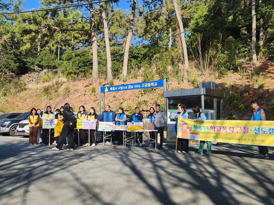 이날 캠페인에는 학교 교직원과 학생자치회 뿐만 아니라 (사)한국청소년육성회 완도지구회(고금지회) 회원, 파출소 경찰관 등 20여명이 참가했다.