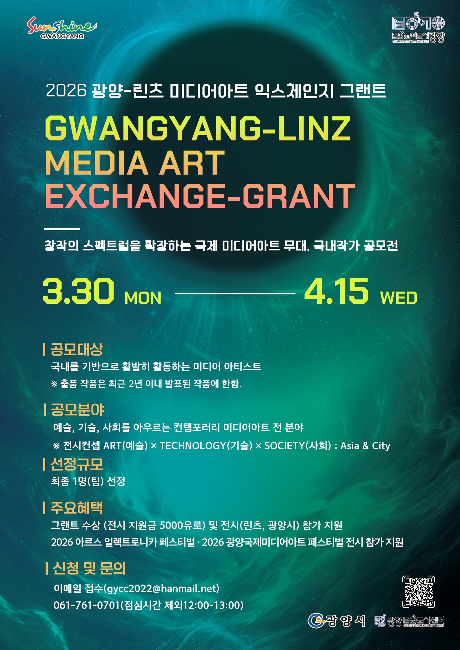 국내 미디어아티스트 대상 - 광양문화도시센터는 오스트리아 린츠와의 예술 교류를 확대하고 국내 미디어아트의 국제 경쟁력을 높이기 위해 「광양-린츠 미디어아트 익스체인지 그랜트(Exchange-Grant)」에 참여할 국내 작가를 공개 모집한다.