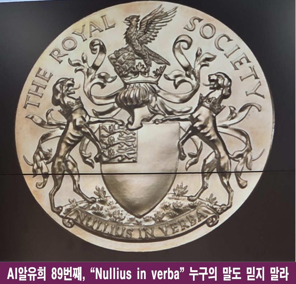 AI알유희 89번째, “Nullius in verba” 이 문구가 예쁜 까닭을 모두 찾아내시오. “Nullius in verba.” 이 짧은 라틴어 문장은 직역하면 “누구의 말도 믿지 말라”라는 뜻이다.