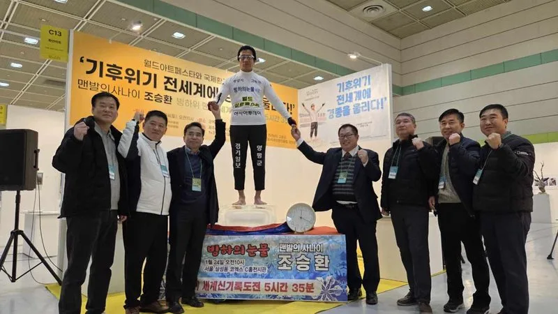 광양시는 광양시 홍보대사인 조승환 씨가 지난 24일 서울 코엑스에서 열린 ‘월드아트페스타’ 개막식에서 ‘얼음 위에 맨발로 오래 서 있기’ 세계 신기록을 경신했다고 밝혔다. ‘맨발의 사나이’로 알려진 조 씨는 이번 도전에서 5시간 35분을 기록하며, 2025년 11월 13일 미얀마 고마다사원에서 세운 종전 기록(5시간 30분)을 5분 넘어서는 쾌거를 이뤘다.
