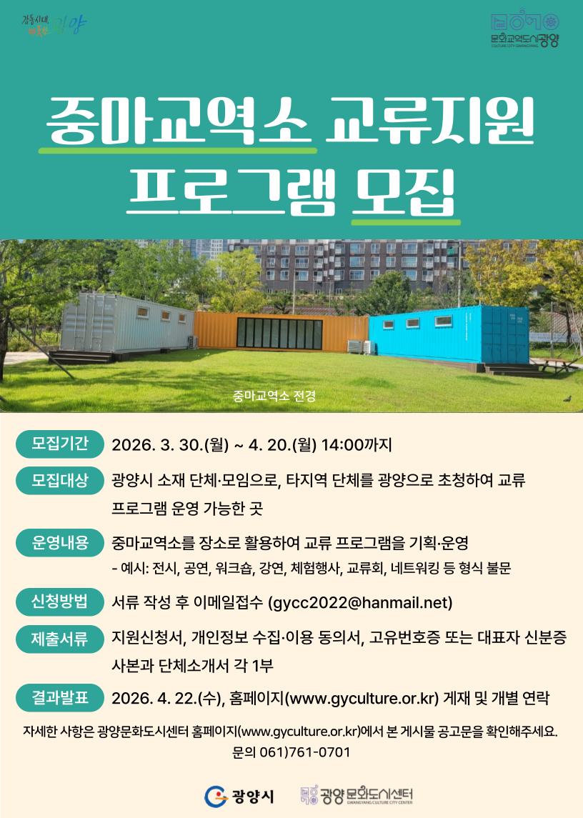 이번 사업은 광양시 소재 단체가 주체가 되어 타 지역 단체를 초청하고, 전시·공연·워크숍 등 다양한 형태의 프로그램을 함께 운영하도록 지원하는 시민 주도형 문화교류 사업이다. ‘중마교역소’는 광양시 마동저수지생태공원에 위치한 문화교류 공간으로, 40피트 컨테이너 3동으로 조성됐다. 2023년 문화도시 조성사업 추진 과정에서 지역 기업이 기증한 중고 컨테이너를 활용해 마련됐으며, 지난해에는 버스킹 공연과 다양한 체험 프로그램으로 구성된 ‘토요피크닉’을 운영한 바 있다.