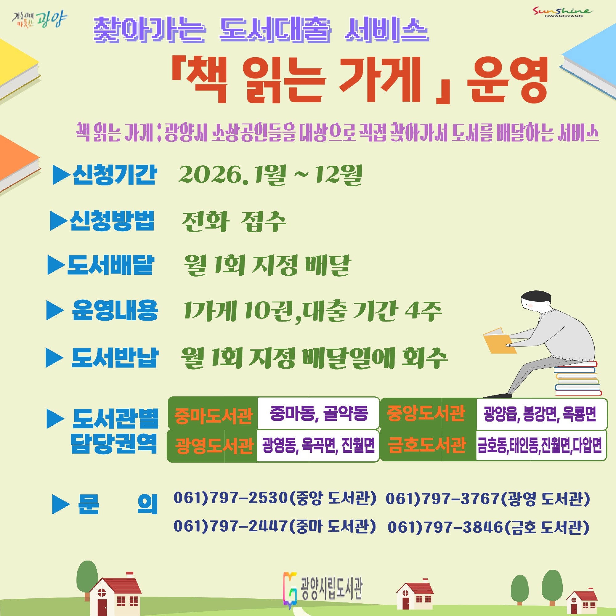 올해는 광양시 전역을 4개 권역으로 나누어 총 80개소를 모집한다. ▲중앙도서관(광양읍·봉강면·옥룡면) ▲중마도서관(중마동·골약동) ▲광영도서관(광영동·옥곡면·진월면) ▲금호도서관(금호동·태인동·진상면·다압면)이 각각 20개소씩 모집하며, 선정된 가게가 매월 도서 10권을 선택해 대출하면 지정된 요일에 직접 전달한다.