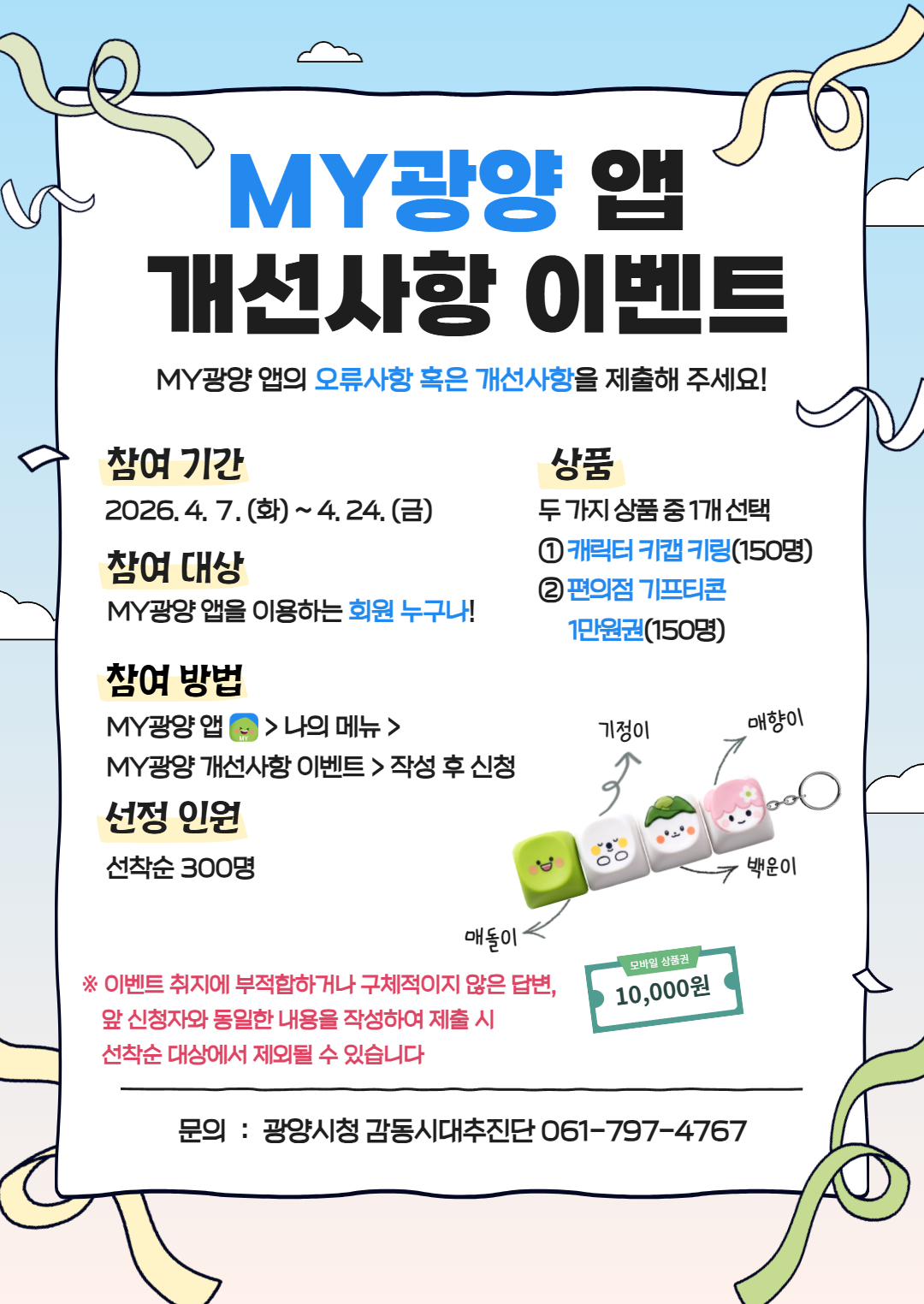 - 참여 시 광양시 캐릭터 4구 키캡 키링 또는 편의점 상품권 지급 - 광양시는 4월 7일부터 24일까지 ‘MY광양 앱 개선사항 이벤트’를 운영한다고 밝혔다.