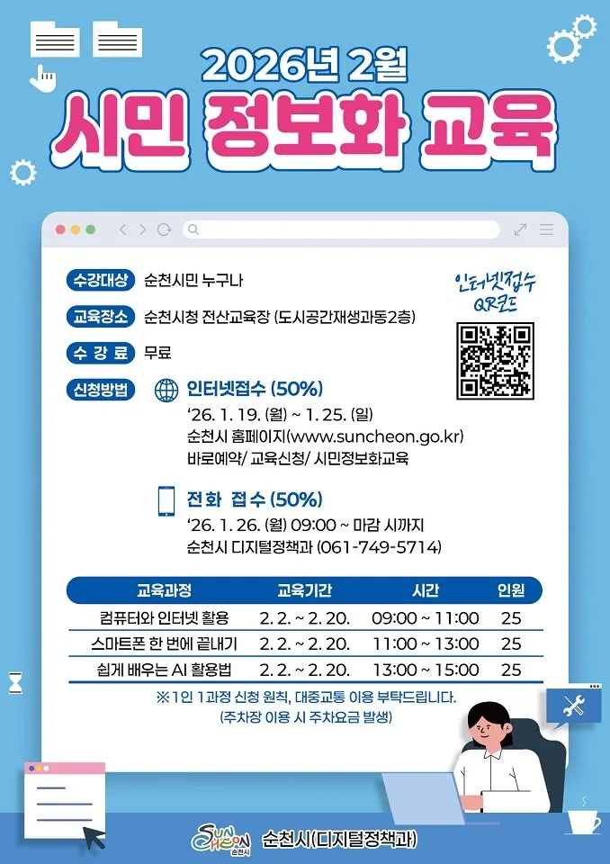 순천시, 디지털 기기 사용에 어려움을 느끼는 시민들을 위한 '2026년 정보화 교육' 수강생 모집 순천시는 디지털 기기 사용에 어려움을 느끼는 시민들이 일상생활에서 겪는 불편을 해소할 수 있도록 '2026년 정보화 교육' 수강생을 오는 19일부터 모집한다고 밝혔다.