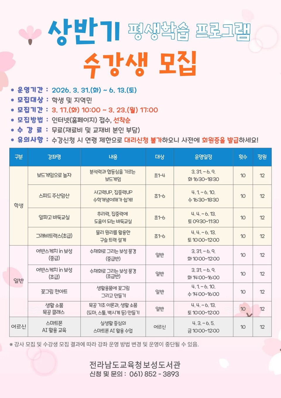 수강 신청은 3월 17일부터 23일까지 보성도서관 누리집을 통해 온라인으로 접수할 수 있다.