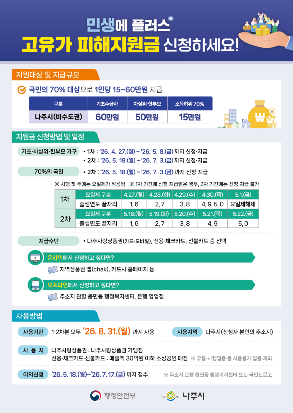 4월 27일부터 신청, 기초생활보장 수급자·차상위 우선 지급 ‘찾아가는 신청’ 운영…고령자와 장애인 편의 강화 “오는 8월 31일까지 사용해야, 미사용 금액은 소멸” 전남 나주시가 중동전쟁으로 인한 고유가·고환율·고물가로 어려움을 겪고 있는 시민들의 생활 안정을 위해 고유가 피해지원금 1차 지급을 4월 27일부터 시작하며 최대 60만 원을 지원하고 찾아가는 신청 서비스를 운영한다.