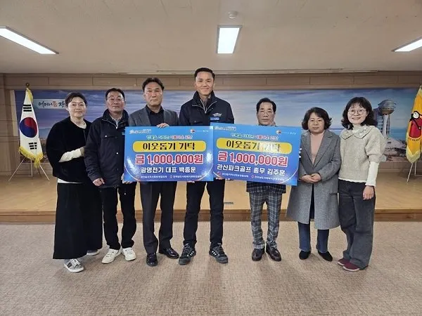김주훈 관산파크골프 총무와 백종운 광명전기 대표는 27일 지역의 어려운 이웃을 위해 사용해 달라며 성금 각 100만 원씩을 관산읍에 기탁했다.