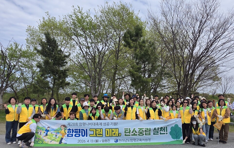 전라남도함평교육지원청(교육장 최은순)은 4월 13일, 함평천 수변 공원 일원에서 교육공동체와 함께하는 ‘2026년 상반기 함그래(함평 Green 미래) 내 고장 도보 탐사(플로깅)’ 활동을 성황리에 개최했다.