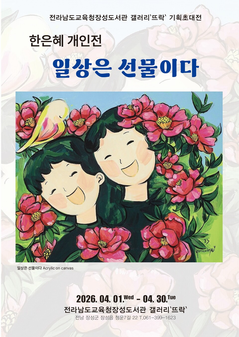 전라남도교육청장성도서관(관장 차계옥)은 4월 1일부터 30일까지 한 달간 도서관 내 갤러리 ‘뜨락’에서 한은혜 작가의 기획초대전 ‘일상은 선물이다’를 개최한다.