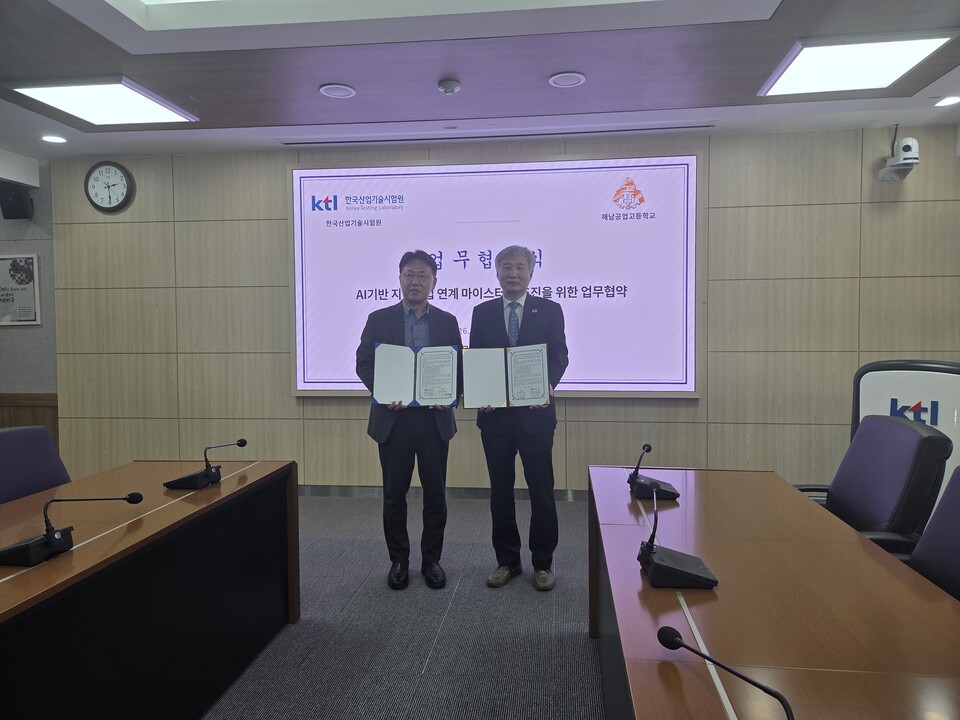 해남공업고등학교(교장 김동천)는 2026년 4월 8일 오후 2시, 한국산업기술시험원 대회의실에서 한국산업기술시험원(KTL)과 「AI 기반 지역산업 연계 마이스터고 추진 협약」을 체결했다.