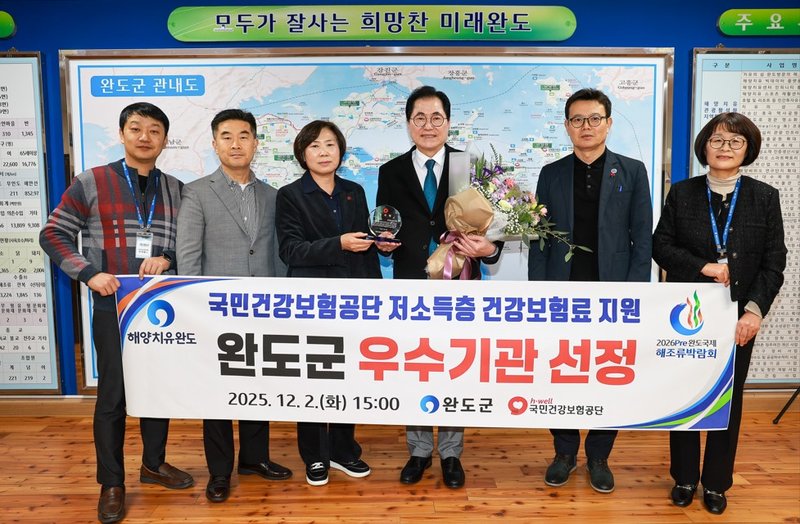 완도군이 국민건강보험공단으로부터 ‘2025년 저소득층 보험료 지원’ 우수 기관으로 선정돼 감사패를 받았다.