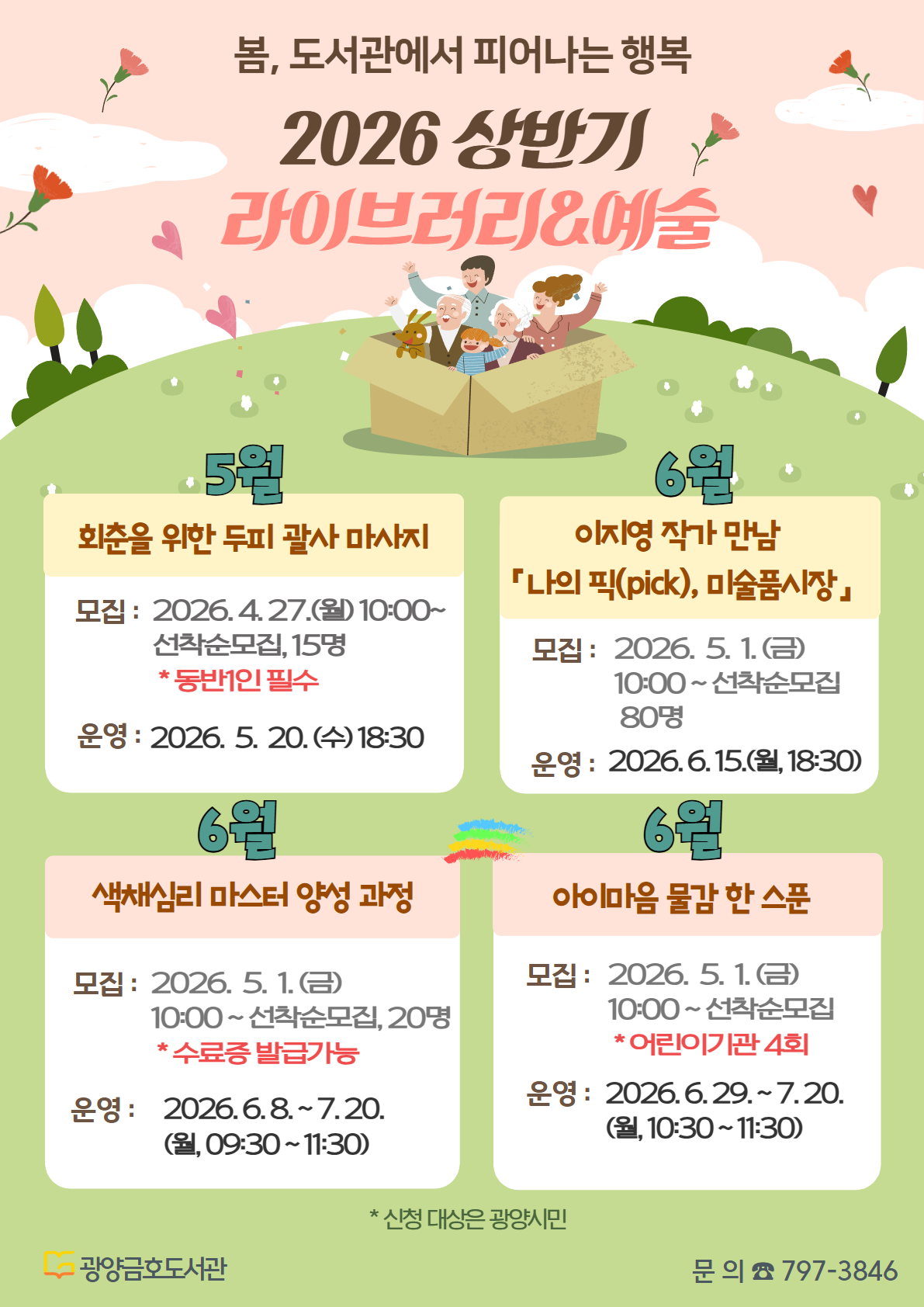 자세한 내용은 광양시립도서관 누리집에서 확인하거나 광양금호도서관으로 문의하면 된다.