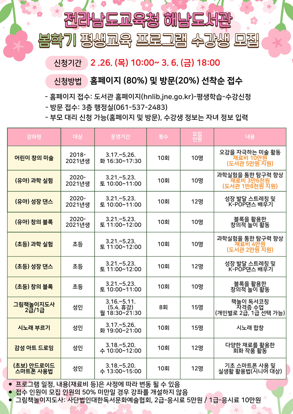 전라남도교육청해남도서관(관장 박은정)에서는 2026년 3월 16일부터 5월 26일까지 2026년 봄학기 평생교육 프로그램을 운영한다.