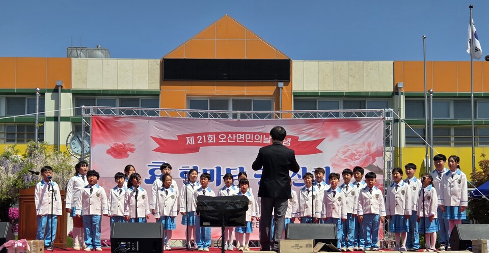 오산초등학교(교장 정성룡)는 4월 25일(토) 제21회 오산 면민의 날 기념 ‘효 한마당 큰잔치’ 식전 행사에서 전교생이 참여한 합창 공연을 성공적으로 선보였다.