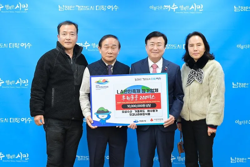 제52회 LA한인축제 및 농수산물 우수상품 엑스포에 참가한 여수지역 4개 업체가 지난 17일 어려운 이웃들을 위해 직접 생산·가공한 멸치, 젓갈, 굴비 장아찌, 갓김치로 구성된 천만 원 상당의 물품을 여수시에 전달했다. 참여한 업체는 오성수산, 젓갈나라 하정식품, ㈜여수명가, ㈜거풍푸드 4곳으로, 지난 10월 16일부터 19일까지 미국 LA에서 개최된 한인축제 및 농수산물 우수상품 엑스포에서 여수 농수산물을 통해 약 2억 8천만 원의 판매 실적을 올리고 우수성을 알렸다. 시 관계자는 “여수의 농수산물 생산·가공 업체가 해외에서 큰 호응을 얻어 성공적인 판촉을 이룩한 데 이어 따뜻한 손길을 전해 주셔서 기쁘고 감사하다”며 “시에서도 기업의 해외 판로 개척 등을 적극 지원할 것”이라고 밝혔다.
