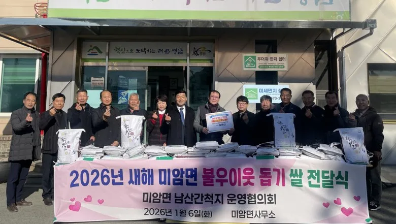 영암 미암면 남산간척지운영협의회(대표 홍재선)가 6일 미암면 마을회관과 경로당에 나눠달라며 10kg들이 쌀 70포대를 면행정복지센터에 전달했다.