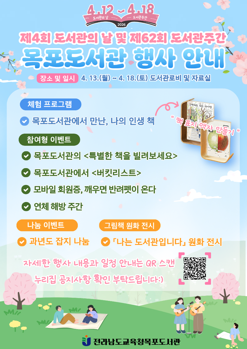 전라남도교육청목포도서관(관장 김춘호)은 제4회 도서관의 날과 제62회 도서관주간을 맞이하여 4월 13일부터 18일까지 ‘도서관 속 작은 펼침, 세상을 여는 큰 열림’을 주제로 특별한 독서문화 행사를 운영한다.