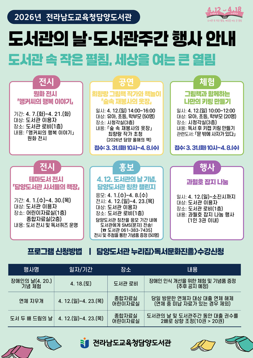 전라남도교육청담양도서관은 2026년 도서관의 날(4. 12.)과 도서관주간을 맞아 4월 30일까지 다양한 독서문화 행사를 운영한다.