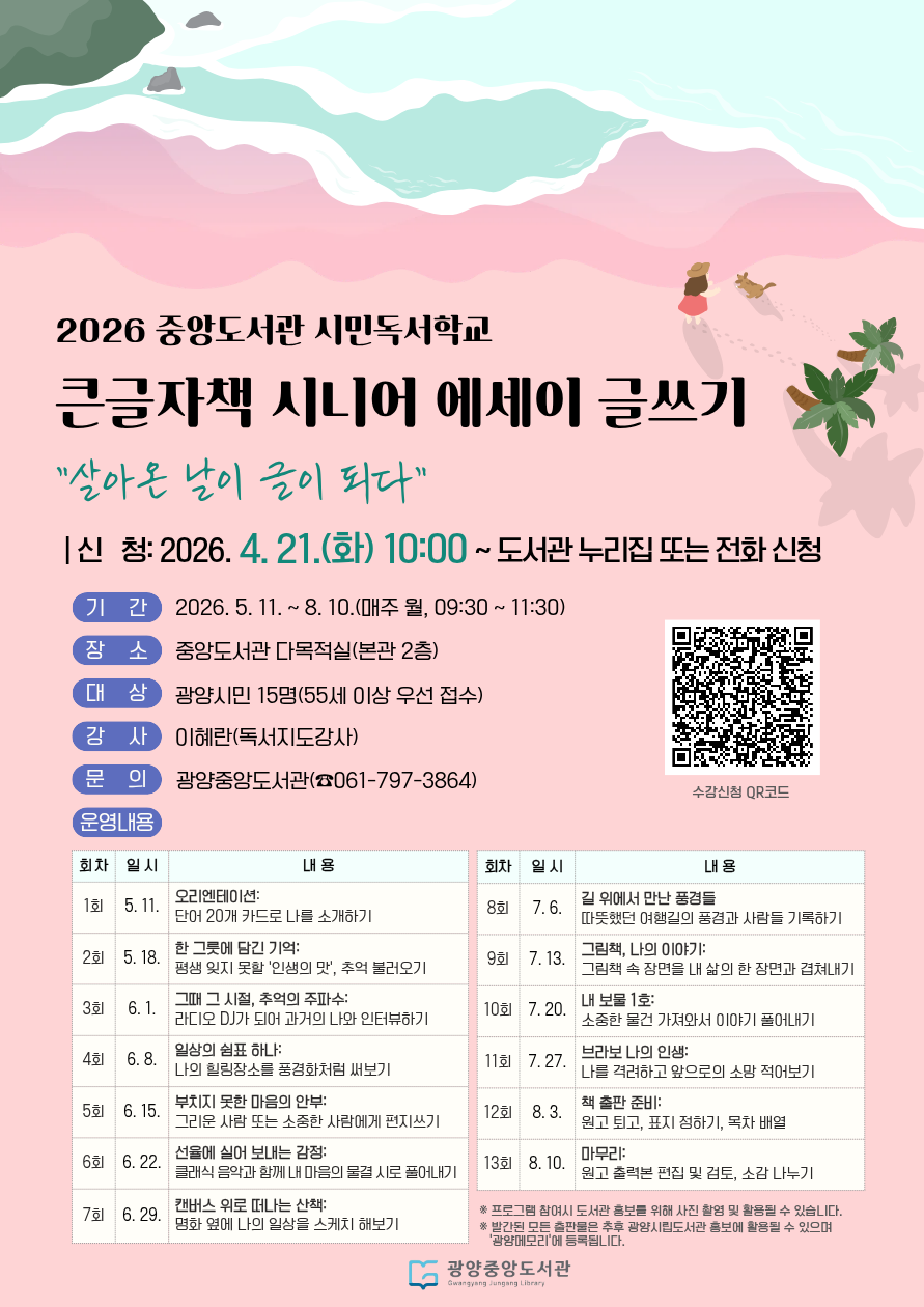 광양중앙도서관은 2026년 시민독서학교의 하나로 「큰글자책 시니어 에세이 글쓰기」 프로그램을 운영하고 참여자를 모집한다고 밝혔다.