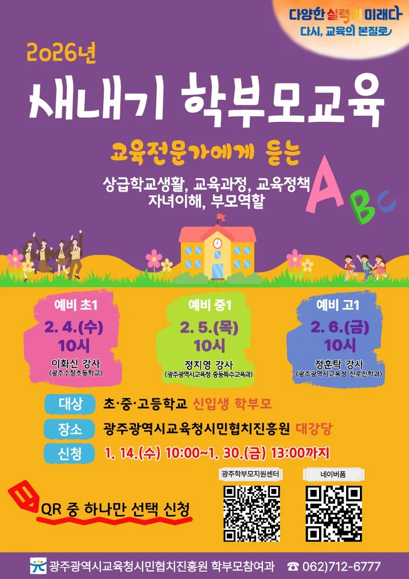 교육은 초등(입학 준비 및 학교생활 적응), 중등(교육과정 및 고교학점제 이해), 고등(대입전형 이해 및 진학 준비) 등 초·중·고별로 진행된다. 4일에는 초등 신입생 학부모를 대상으로 광주수창초등학교 이화신 교사가 ‘초등학교 1학년 길라잡이’를 주제로 입학 준비사항과 학교생활 적응 정보를 제공한다. 5일에는 시교육청 정지영 장학사가 ‘자유학기제와 고교학점제 이해’를 주제로 중학교 교육과정을 안내하며, 6일에는 시교육청 정훈탁 장학관이 ‘대입전형 이해와 진학 준비’ 방안을 설명한다.