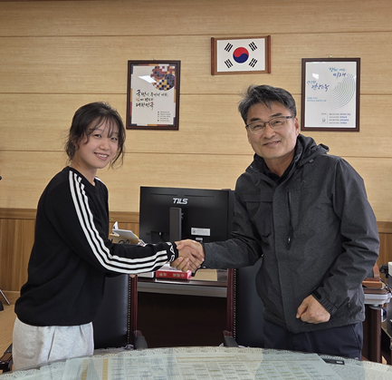 함평골프고등학교 교장실에서 KLPGA 준회원 자격을 취득한 박하영 학생이 교장의 축하를 받고 있다.