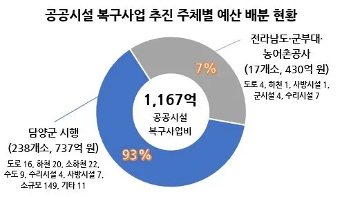 담양군이 확보한 복구비 1,230억 원은 크게 ‘공공시설 복구비(1,167억 원)’와 ‘사유시설 재난지원금·위로금(63억 원)’으로 나뉜다.