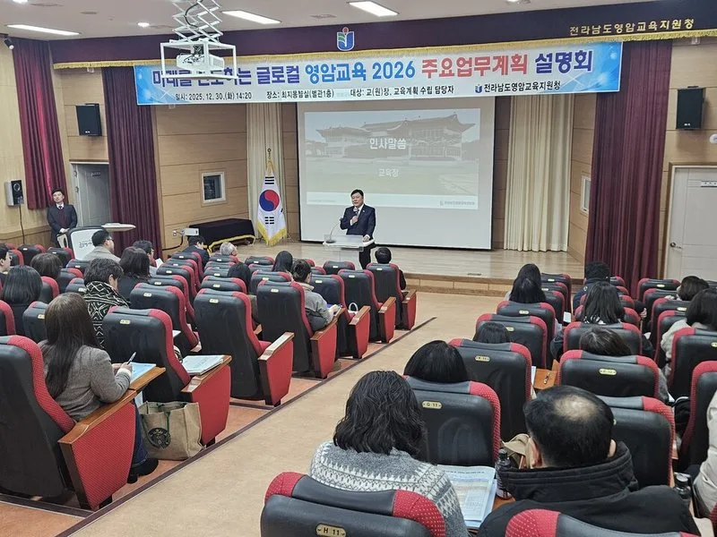영암교육지원청은 12월 30일(화) 영암교육지원청 최지몽지실에서 관내 유․초․중․고․특 교(원)장, 업무 담당자를 대상으로 글로컬 영암교육 실현을 위한 「영암교육 2026 주요업무계획」설명회를 실시했다.