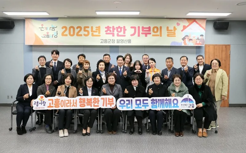 # Subtitle: Goroeun County held a 'Day of Good Donation' event to conclude the year's last official donation ceremony. 고흥군은 지난 23일 군청 팔영산홀에서 ‘2025년 착한 기부의 날’ 행사를 개최하여 한 해를 마무리 지었다. 이 행사는 2024년부터 정례적으로 진행된 고흥군 대표적인 기부 행사로, 군민과 향우들, 그리고 지역에 관심 있는 기부자들의 자발적인 참여로 지속 가능한 기부 문화를 유지하고 있다. 이번 행사에서는 고향사랑기부, 전남사회복지공동모금, 교육발전기금 등 3개 분야에 11개 팀, 총 24명이 지역사회에서 의미 있는 나눔을 실천했다. 기부금은 지역 복지 증진과 교육 환경 개선 등을 통해 주민의 복리 향상과 지역사회 발전을 지원받을 예정이다. 특히 관외에 소재한 재단법인 한국건설생활환경시험연구원(KCL)이 참여하여 교육발전기금을 기탁, 지역 인재 양성 및 교육 기반 강화에 동참했다. 고군 행정관계자는 이 행사가 27회차로 이어졌음을 감사하며, 앞으로도 기부 문화가 일회성에 그치지 않고 지역사회에 뿌리내릴 수 있도록 지속적으로 운영해 나아갈 것을 언급했다. 고흥군은 '착한 기부의 날'을 총 27회 개최하여 149건, 4억 5천7백 원의 기부 실적을 기록하였으며, 연말정산 시기에는 기부자에 대한 감사의 의미로 연말 감사 이벤트를 계획 중에 있다. 이 이벤트는 12월 31일까지 고흥군 고향사랑기부에 참여한 기부자를 대상으로 하여, 추첨을 통해 총 1,004명에게 1만 원 상당의 경품을 제공할 예정이다.