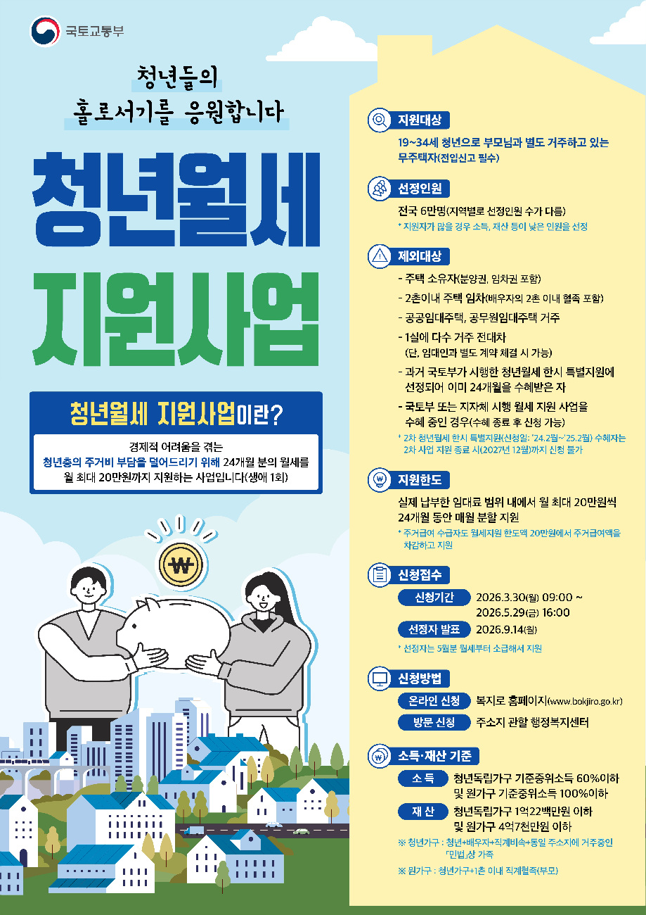 신청을 희망하는 청년은 임대차계약을 맺은 주택에 전입신고를 마친 뒤, 3월 30일부터 5월 29일 오후 4시까지 복지로 누리집이나 주소지 읍면동사무소에서 신청하면 된다.